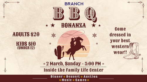 Come support The Branch student ministry for an evening to remember. Our students invite you to participate in a dinner and game night. We will serve BBQ. Not to mention, we will also have an auction of several one of a kind items. This event is a fundraiser to help offset the cost of youth summer camp this summer. We are looking forward to seeing you on March 2nd, at 5:00 PM!